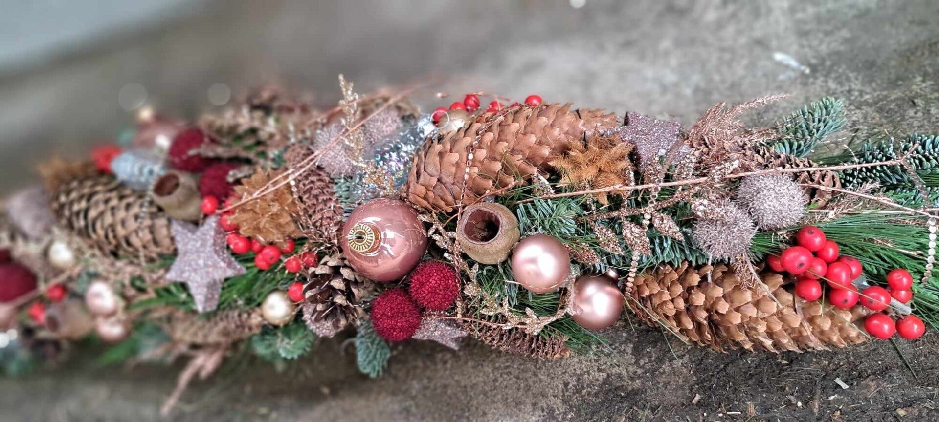 Deze ochtend gaan we een lange guirlande/een langwerpig kerststuk opdraaien met diverse soorten kerstgroen. Wanneer de basis gemaakt is verwerken we er de mooiste sfeervolle kerstmaterialen erin.