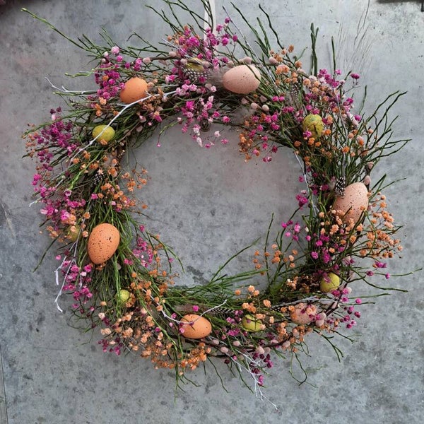 Breng het voorjaar in huis of aan de deur met deze vrolijke paaskrans. Deze avond gaan we aan de slag met wilde voorjaarstakken, kleurrijk gipskruid, eitjes en veertjes. Een echte eyecatcher dus en het leuke is, de krans kan geheel indrogen.